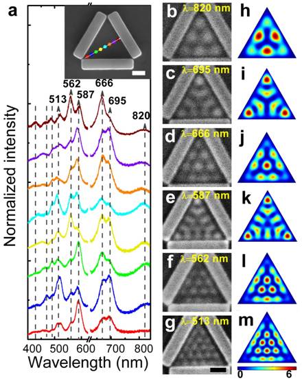 最近,俞大鹏教授和张家森教授开展团队开展合作研究,团队博士生张洋、朱新利等发展了一种制备超平滑表面的金属纳米结构的模板剥离新方法,该方法首先将PMMA旋涂在硅、石墨等基片上,利用EBL制备出带有所设计结构的PMMA模板;再镀一层厚度大于PMMA厚度的金属层,将金属层粘到另外一块硅片上;从PMMA上揭下金属层并将剩余的PMMA清洗掉,就得到所需的金属纳米结构。利用此方法制备的银纳米结构的表面粗糙度达到0.55 ~ 0.88 nm,优于其它镀膜方法一个量级以上。利用这种方法还可以方便地制备出陡直高深宽比、间距小于10纳米的不同的金属纳米结构。为了证明该方法的优越性,他们制备了一系列金属银SPP纳米共振腔,腔的反射镜由凸起的金属墙组成。他们利用配有阴极荧光系统的扫描电子显微镜研究了三角形纳米腔中SPP共振模式的形成机理,并获得了清晰的共振模式图像。实验结果结合理论模拟证明,利用这种方法可以获得低的传输损耗和高的反射率,并可以获得非常小的SPP纳米腔模体积和总体积,可望在很多领域获得重要应用。该结果于8月23日发表在纳米科技领域的顶级刊物《先进材料》(Advanced Materials 2010, Xinli Zhu et al.)的网络版上:http://dx.doi.org/10.1002/adma.201001313。《先进材料》现在的影响因子IF = 8.379。